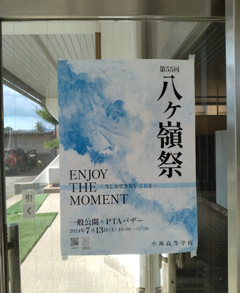 しばらく前から4枚の玄関扉には本校の文化祭、八ヶ嶺祭のポスターが張られています。今年の一般公開は、7月13日(土)です。生徒たちの学習や特別活動の成果を発表します。PTAの皆様にも、恒例の「PTAバザー」で、新鮮な農産物を出品いただきます。また、地域のNPO法人の皆様や連携先の信州短期大学の皆さんにもご協力いただきにぎやかな学園祭となります。皆様、どうぞ小海高校へお出かけくださいませ!
