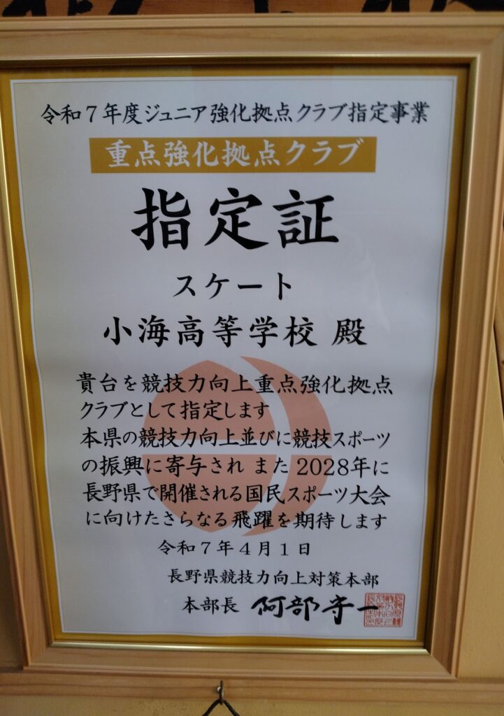9/12(金)に長野県観光スポーツ部国スポ・全障スポ大会局競技力向上対策課からお二人の指導主事が来校され、標記の指定証を受け取りました。昨年度までは強化拠点クラブの指定でした。また、1年生の渡辺公雅さんが強化指定選手として指定されました。チームの、各選手の今シーズンの活躍に期待しています。