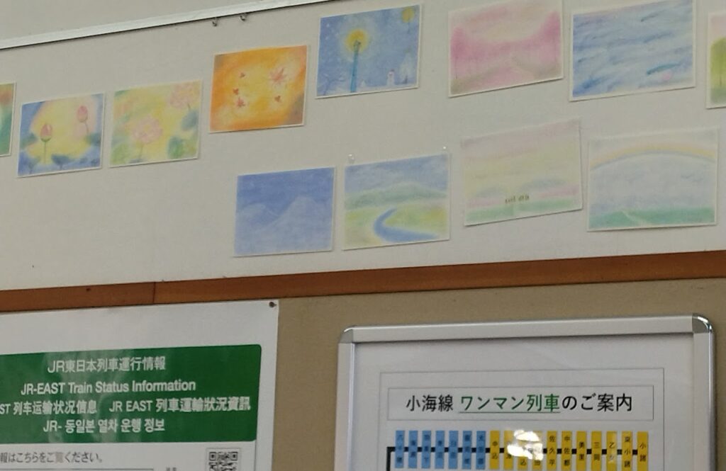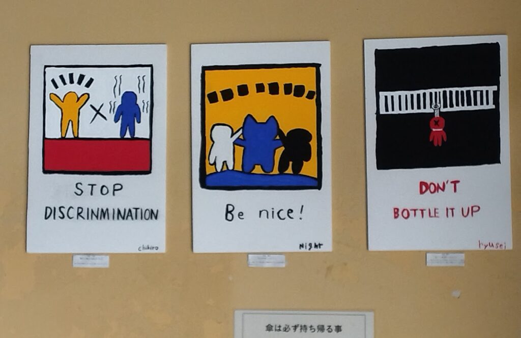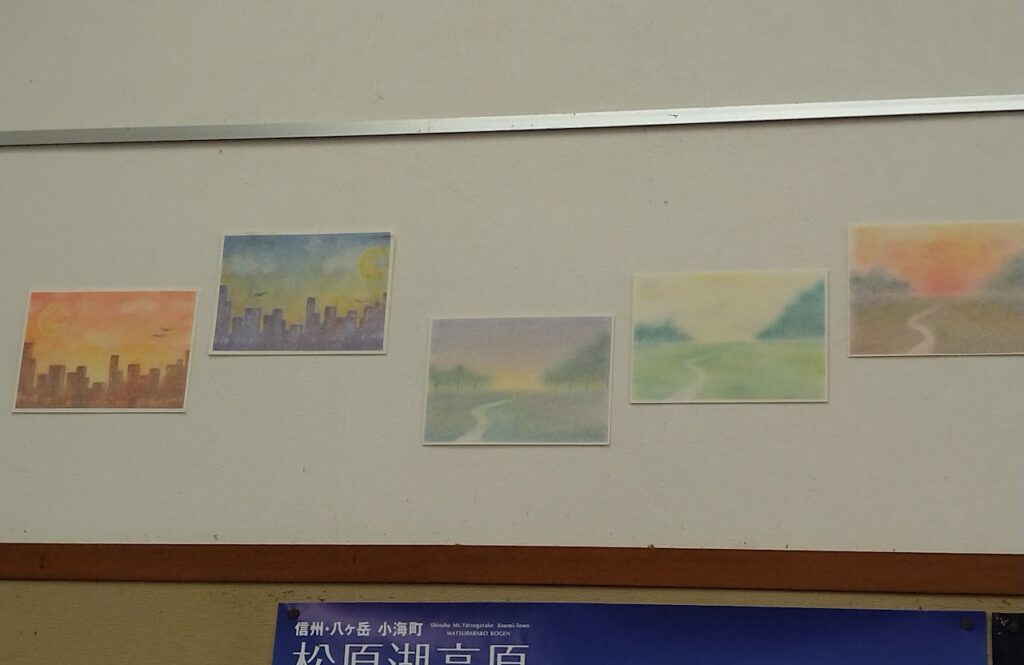 さて、左側写真は小海駅の待合室。11月から飾られている絵手紙で、3年生美術一般選択者の作品です。右側写真は南校舎西階段の掲示板。美術Ⅲ選択者の水彩画で、校舎内、周辺の風景です。続く2枚は美術Ⅱ選択者によるキース・へリングの作風で描いたメッセージアイコン、とてもユニークです。