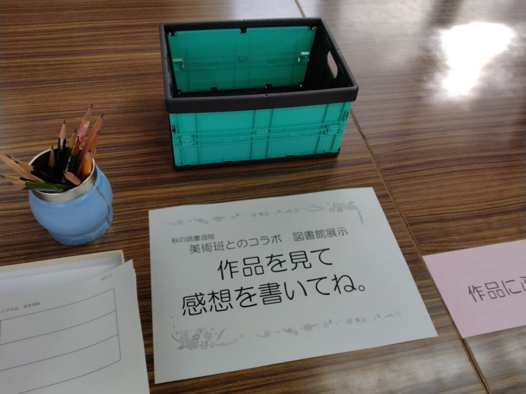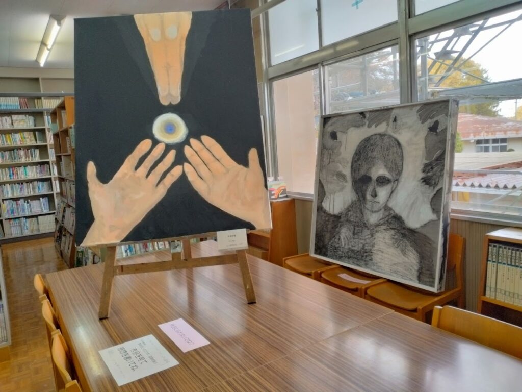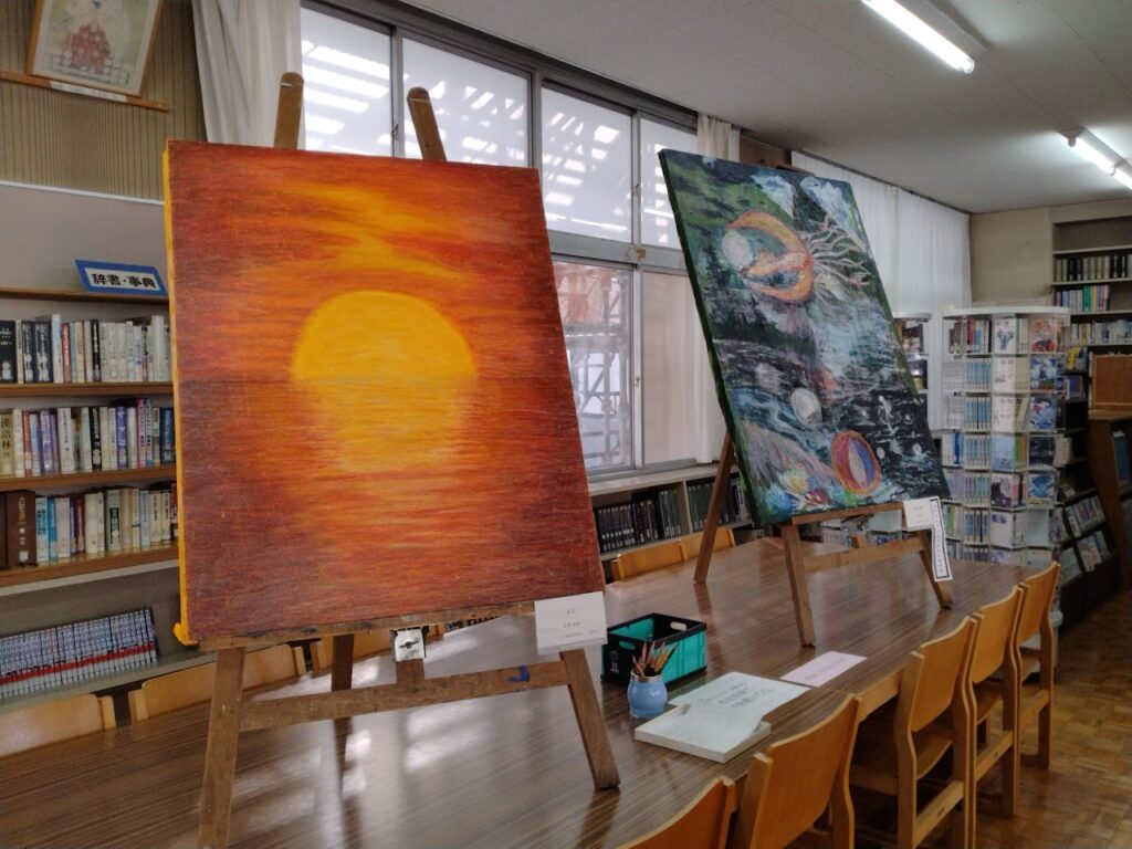 図書館入り口に図書委員おすすめの本を紹介コーナーを作り、館内では美術班の作品を展示しました。作品展示はもうしばらく行います。多くの生徒の来館を待っています。