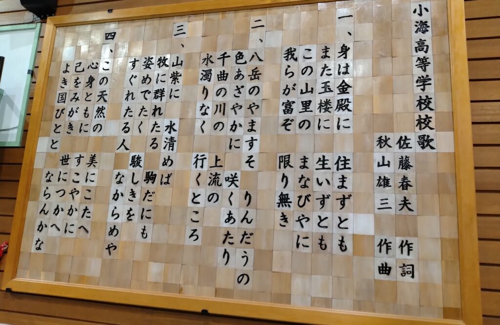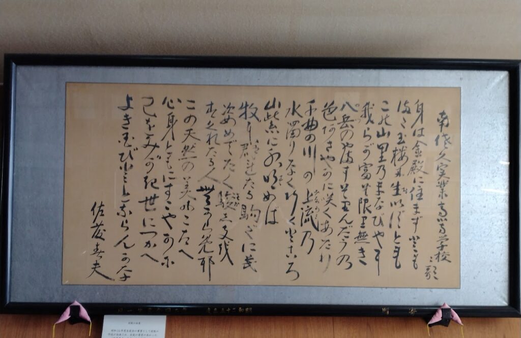 本校では式の都度、2番まで校歌を歌います。写真は校歌の額です。作詞者の佐藤春夫先生直筆の校歌は第2回卒業生の寄贈による額に納められ、校長室に飾られています。もう一つは体育館に飾られています。こちらは全校制作でしょうか?